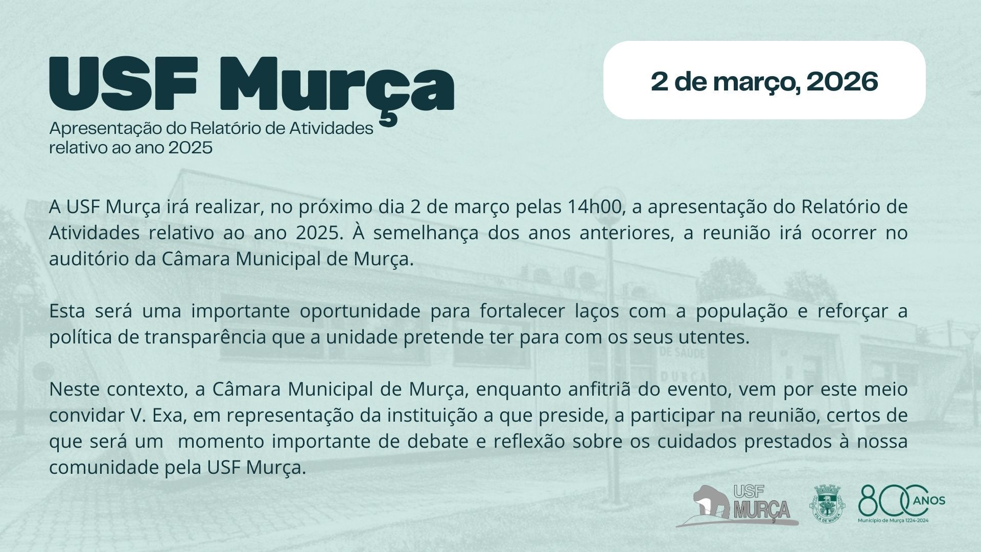 Neste contexto, a Câmara Municipal de Murça, enquanto anfitriã do evento, vem por este meio convidar V. Exa, em representação da instituição a que preside, a participar na reunião, certos de que será um momento importante de debate e reflexão sobre os cuidados prestados à nossa comunidade pela USF Murça.