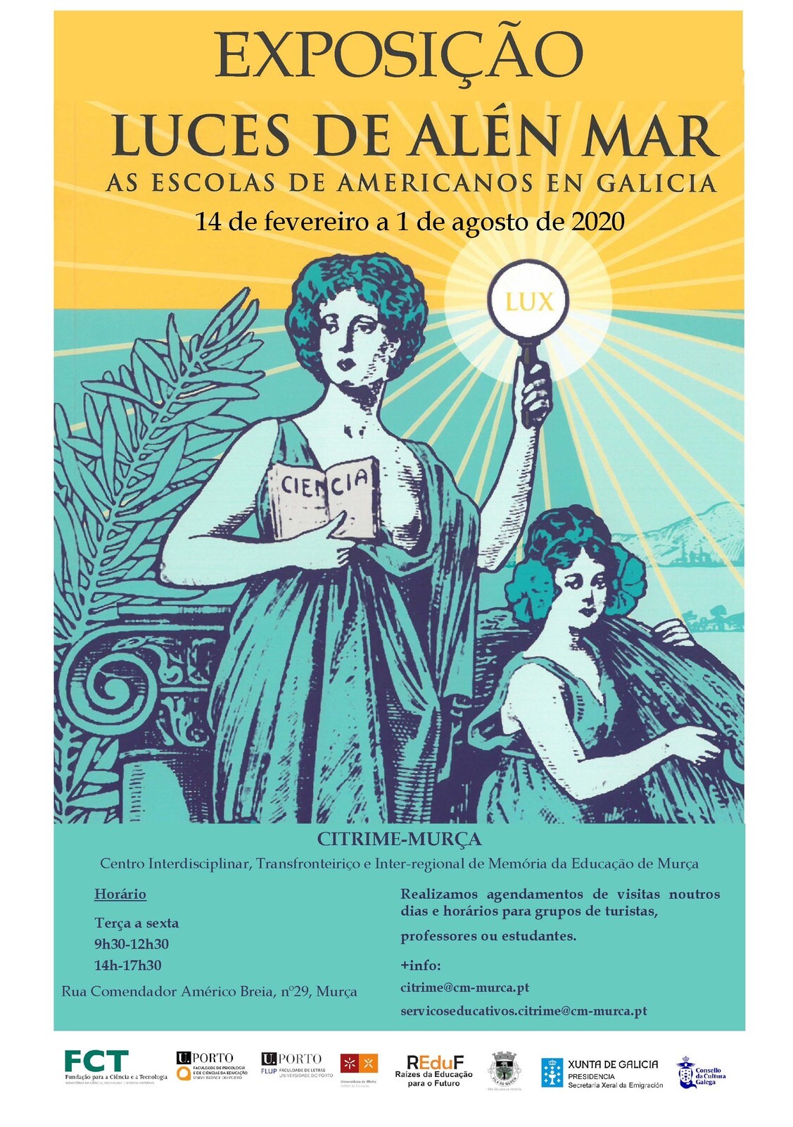 O CITRIME – Centro de Memória da Educação de Murça, em funcionamento na antiga Escola n.º 1, reabrirá, de 23 de junho a 30 de agosto, a visitação à Exposição “Luces de Alén Mar: A escola de Americanos na Galícia”, cuja vinda e permanência em Murça é resultado da parceria realizada entre o Projeto Raízes da Educação para o Futuro (REduF), financiado pela FCT (Referência PTDC/CED/EDG/30342/2017) e o Consello de Cultura Galega –Espanha.