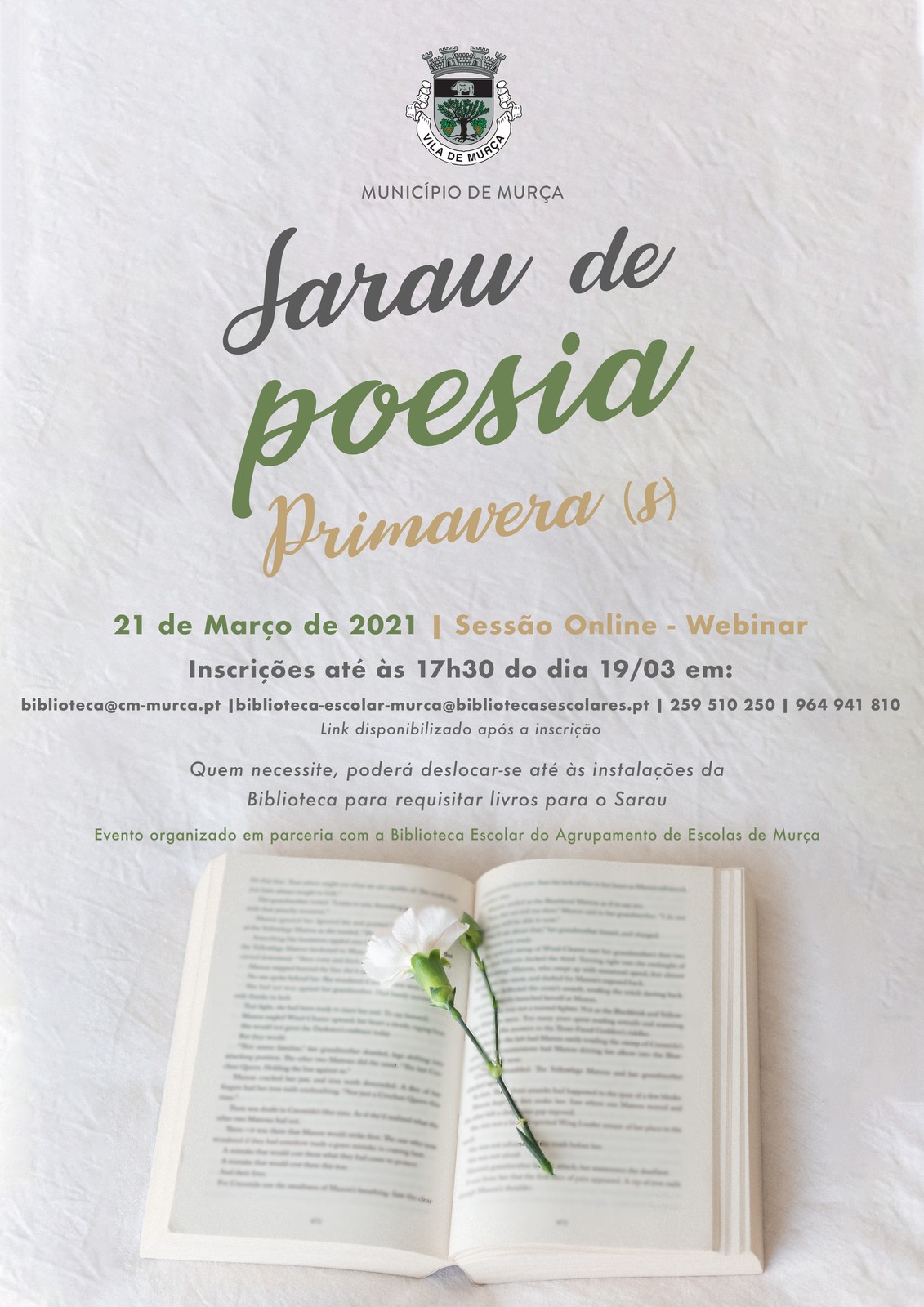 No próximo dia 21 de março, pelas 21:00, a Biblioteca Municipal e a Biblioteca Escolar do Agrupamento de Escolas de Murça, pretendem levar a efeito um "Sarau de Poesia" Online-Webinar.
