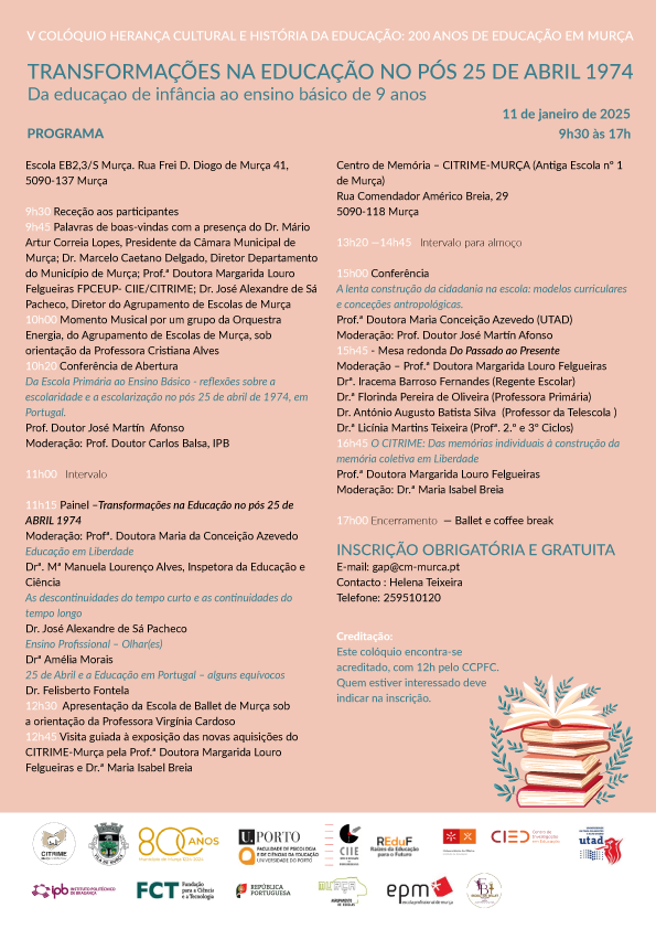 No momento em que se celebraram os 50 anos do 25 de abril, não quis o CITRIME - Murça ficar alheio a um momento tão marcante na História do nosso país e para a Liberdade que hoje disfrutamos. Este V Colóquio de Herança Cultural e História da Educação: 200 anos de educação em Murça, pretende refletir sobre as TRANSFORMAÇÕES NA EDUCAÇÃO NO PÓS 25 DE ABRIL 1974.