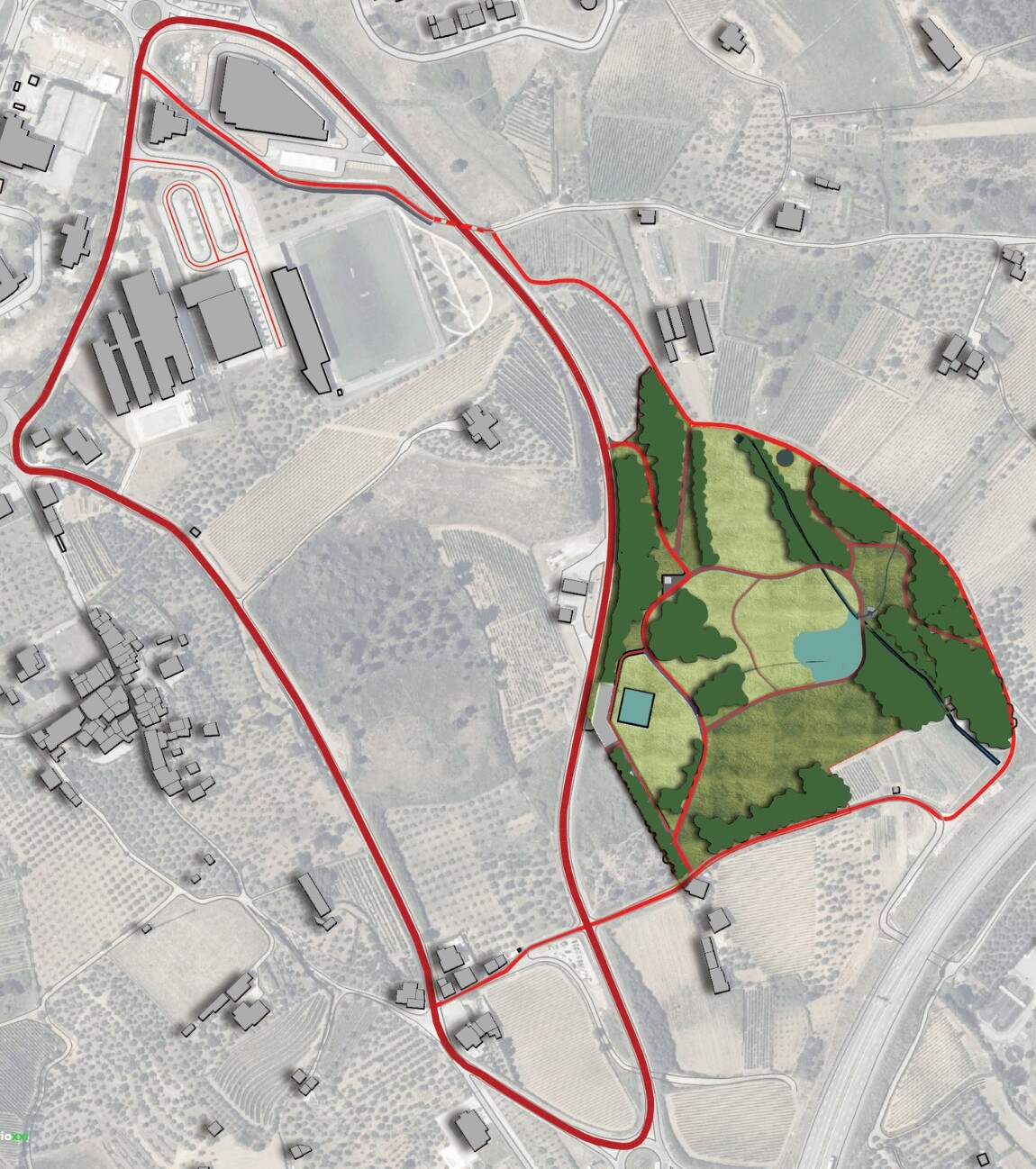 O projeto prevê manter e valorizar as bacias de retenção de água, o bosque e arvoredo e as linhas de água existentes.