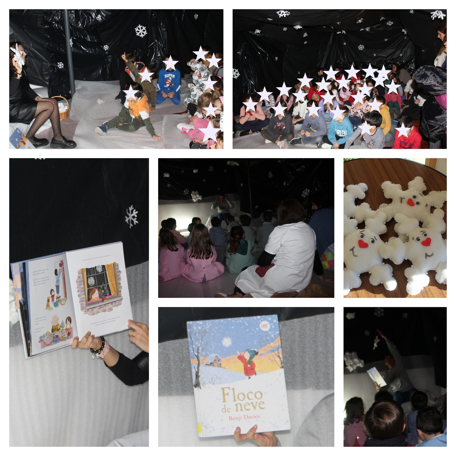 O silêncio e a atenção das crianças marcaram o momento, ouvindo uma história encantadora do livro; “Floco de Neve” do escritor; Benji Davis.