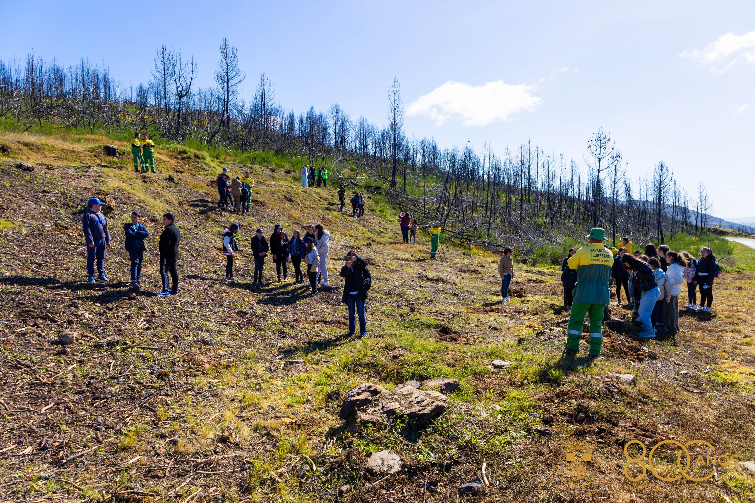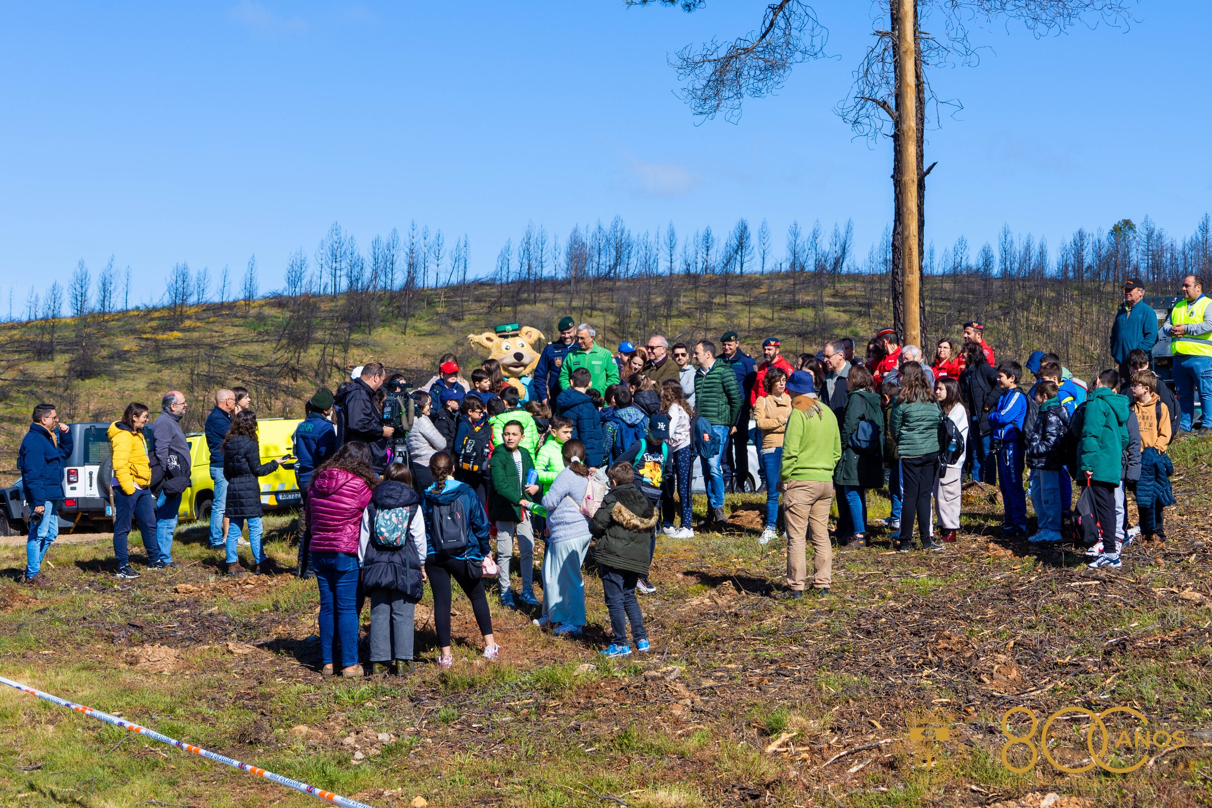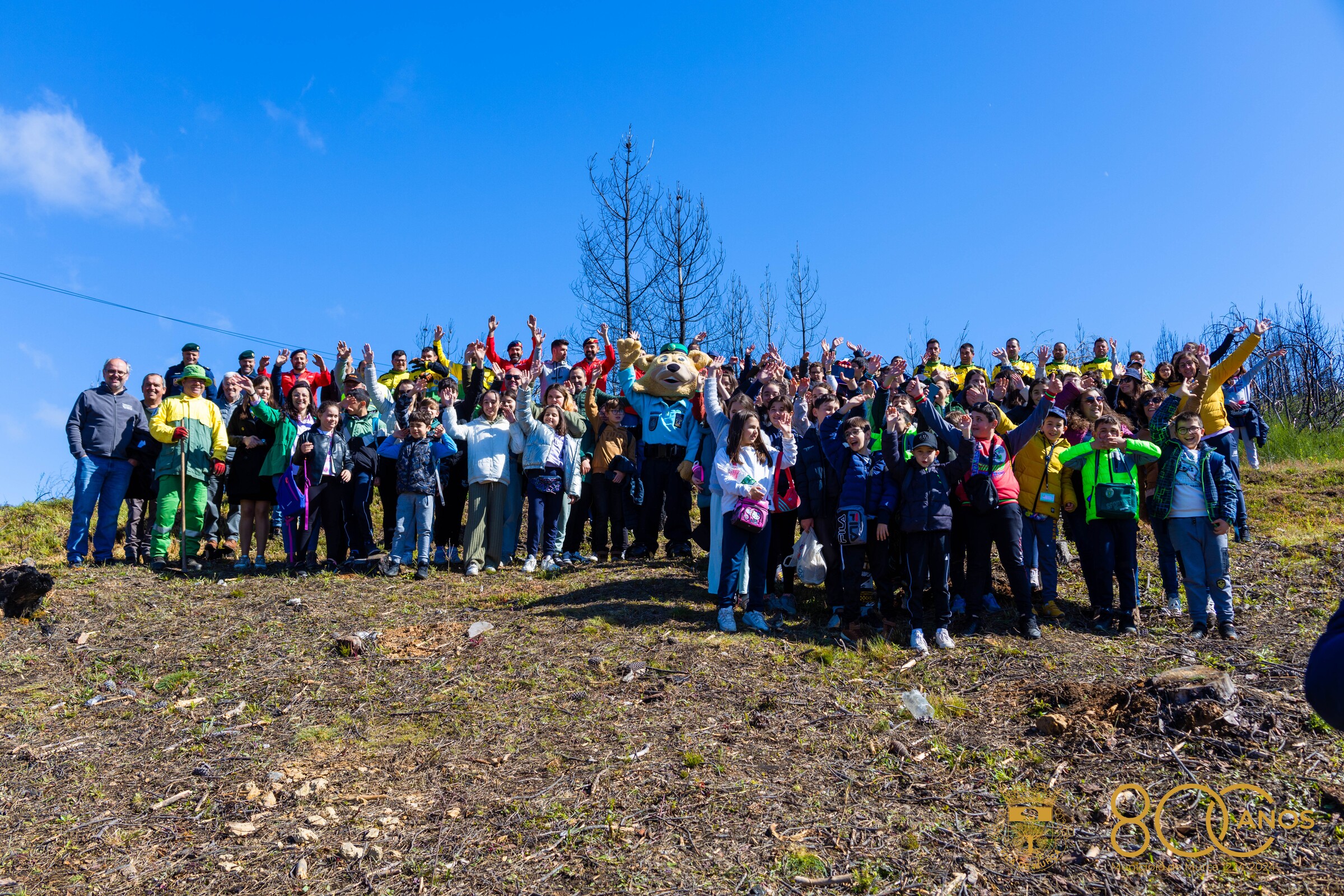 Alunos e professores, guardas, bombeiros, sapadores florestais, Presidente da Assembleia Municipal, Presidente da Câmara, membros do Executivo, elementos do município e da Cruz Vermelha juntaram-se esta manhã na zona de Mascanho, concelho de Murça, uma área atingida pelo grande incêndio que ocorreu em julho de 2022 e devastou 7 mil hectares, 4 mil dos quais de povoamento florestal.