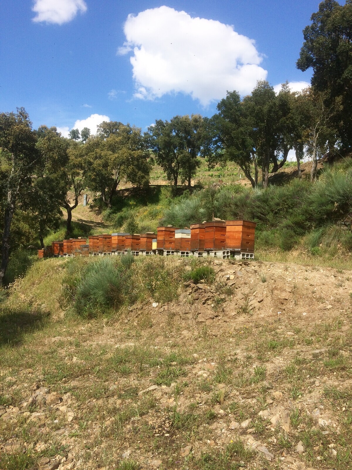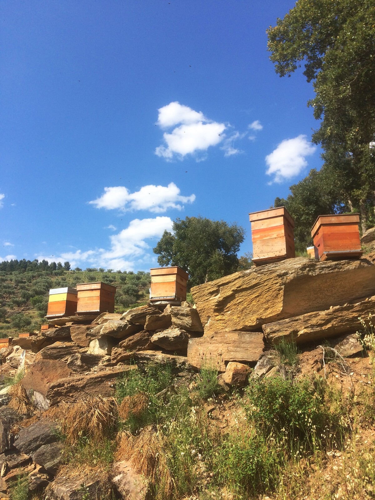 Começaram com meia dúzia de colmeias. No primeiro ano tiveram alguns percalços, mas Vasco Moreira foi aprendendo, fez formação de apicultura e hoje, cinco anos depois, têm 75 colmeias e uma produção anual de cerca de 250 quilos de mel.