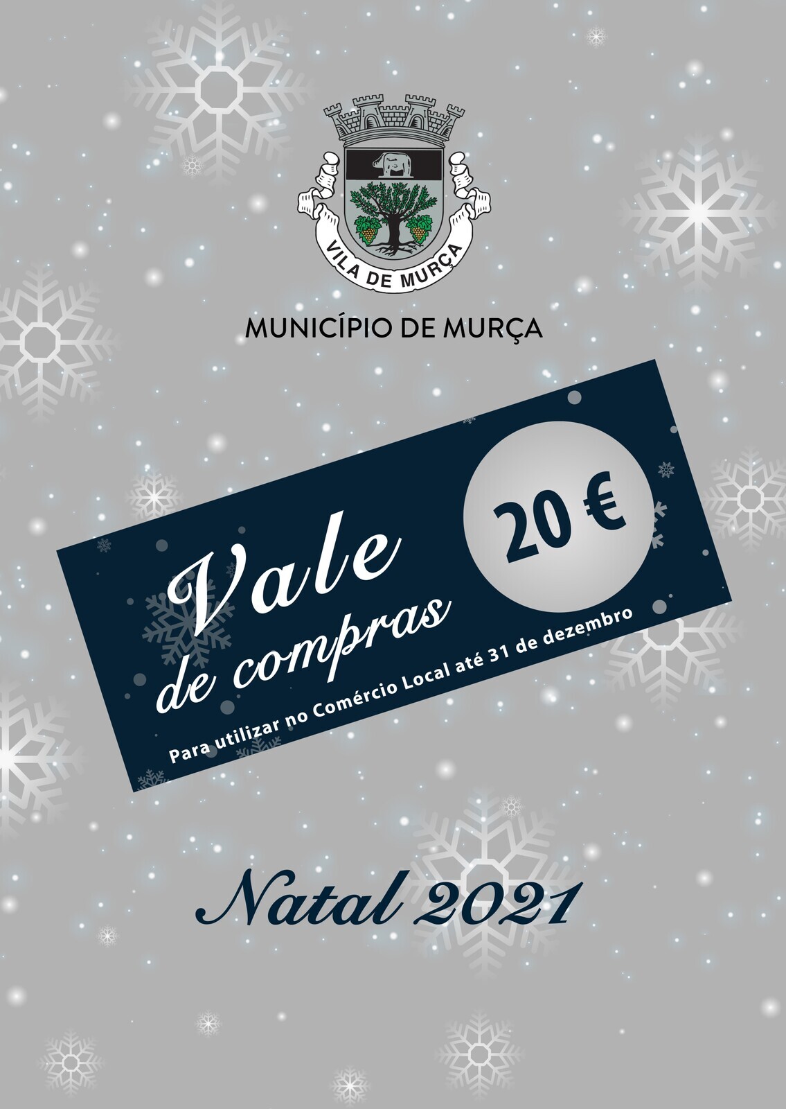 O Vale de Compras Natal 2021, no valor de 20€, é dirigido aos seniores e pessoas portadoras de deficiência, para consumir em bens alimentares no Comércio Local de todo o Concelho.