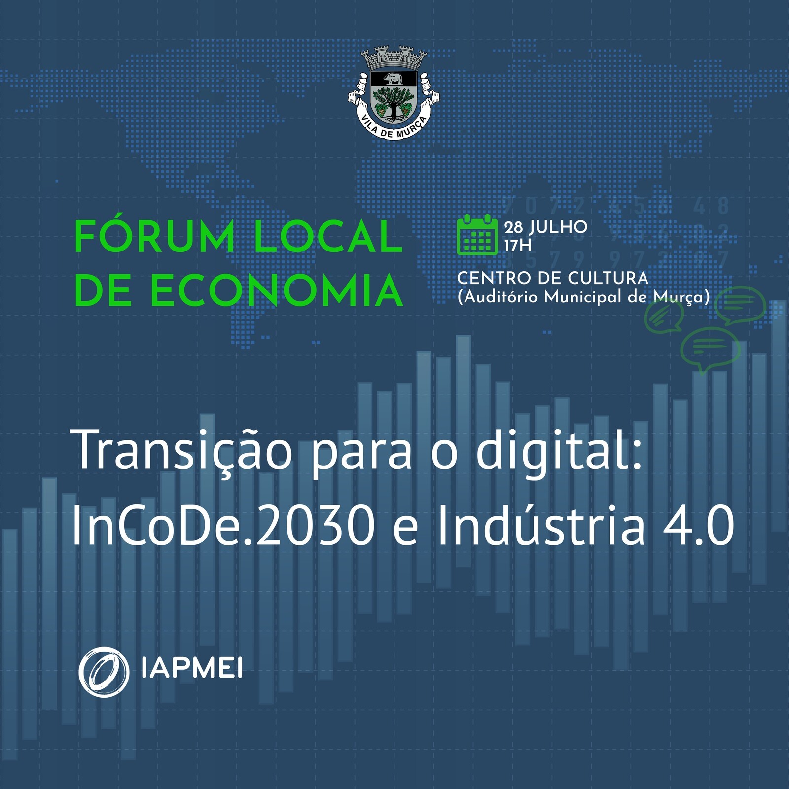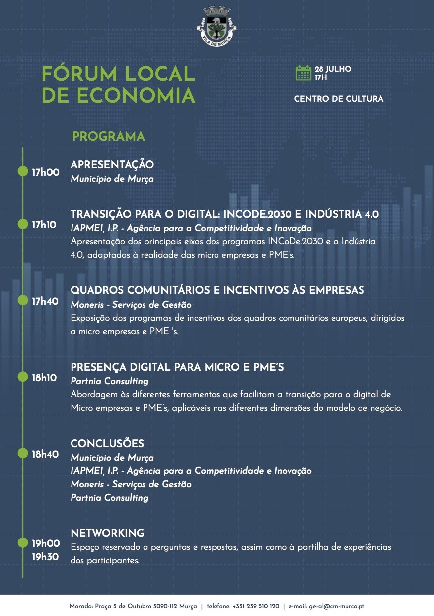 O Município de Murça promove o Fórum Local de Economia, com objetivo sensibilizar o tecido empresarial local e regional para a importância da digitalização dos negócios ao abrigo dos programas INCoDe.2030 e Indústria 4.0, partilhando dos objetivos de contribuir para a literacia e a inclusão digitais, bem como esclarecer sobre os fundos de incentivo comunitário e partilhar ferramentas de para a migração digital, visando o aumento da competitividade do ecossistema empreendedor do território.