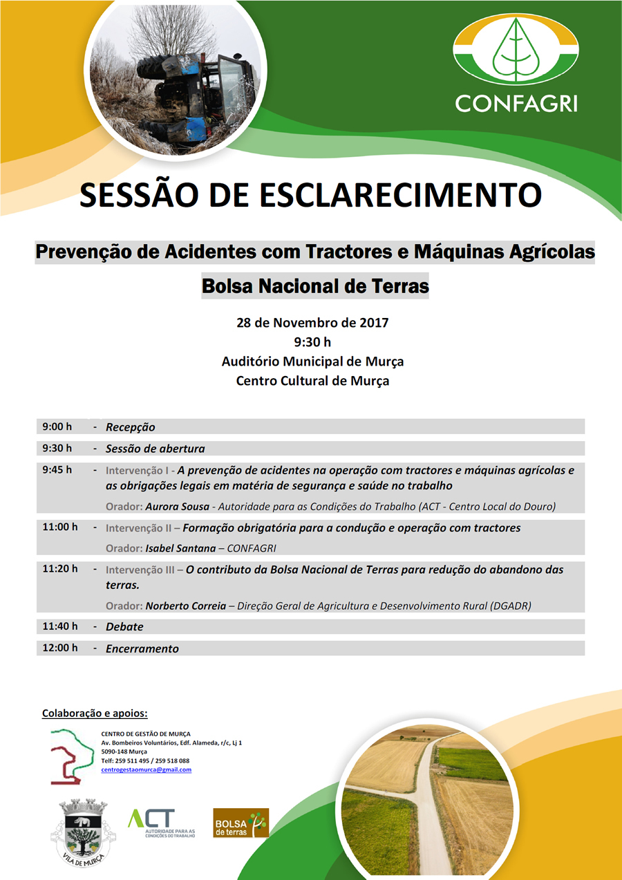 A CONFAGRI realiza no próximo dia 28 de novembro uma sessão de esclarecimento com agricultores em Murça, onde profissionais e técnicos do setor agrícola irão alertar para os riscos inerentes à condução de tratores e máquinas agrícolas e aconselhar quanto à forma de prevenir os acidentes de trabalho que resultam dessa atividade, a principal causa de morte no setor.
