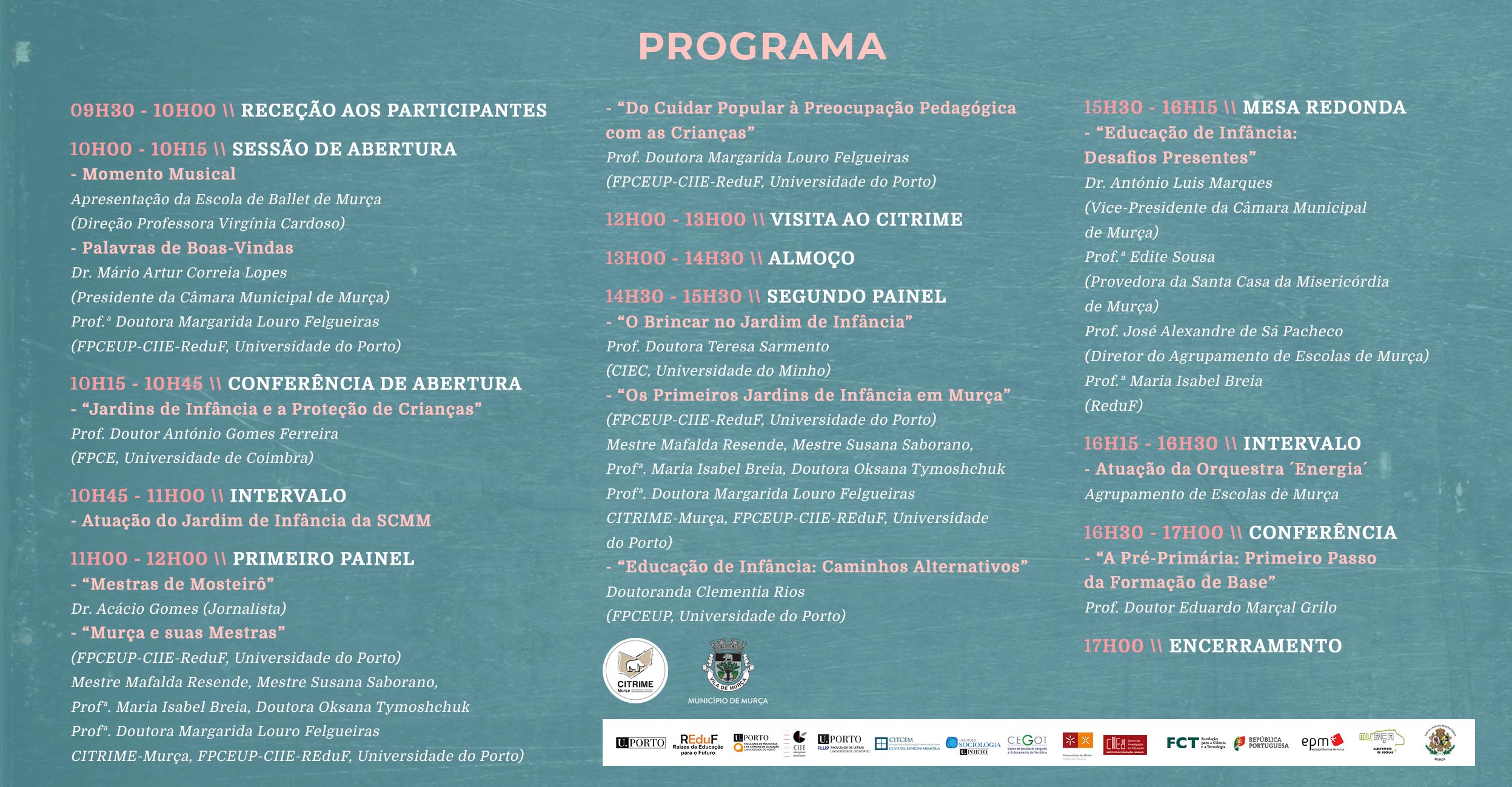 O colóquio é constituído por comunicações de especialistas em história e em educação de infância, apresenta alguns resultados da investigação em curso sobre as mestras e os primeiros jardins de infância em Murça e uma síntes