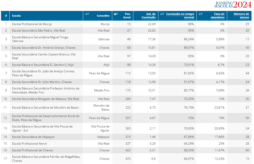 Ainda segundo dados divulgados pelo Ministério da Educação e analisados pelo Jornal de Notícias, a Escola Básica e Secundária de Murça registou uma impressionante ascensão no ranking nacional, subindo da 608.ª posição em 2023 para a 196.ª posição em 2024. A média das notas nos exames das dez principais disciplinas atingiu os 12,22 valores. Além disso, a taxa de conclusão dos 2.º e 3.º ciclos é agora de 100%, enquanto no ensino secundário a taxa de conclusão ronda os 80,8%. No ranking distrital, a escola ocupa a terceira melhor posição.
