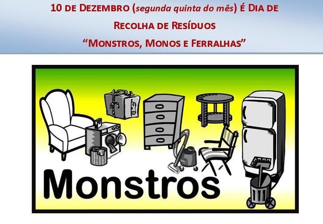 Resíduos Sólidos Urbanos “Monstros, Monos e Ferralhas” são resíduos designados por objetos domésticos volumosos que, pela sua dimensão, volume, forma ou peso, não possam ser recolhidos pelos meios normais de remoção.