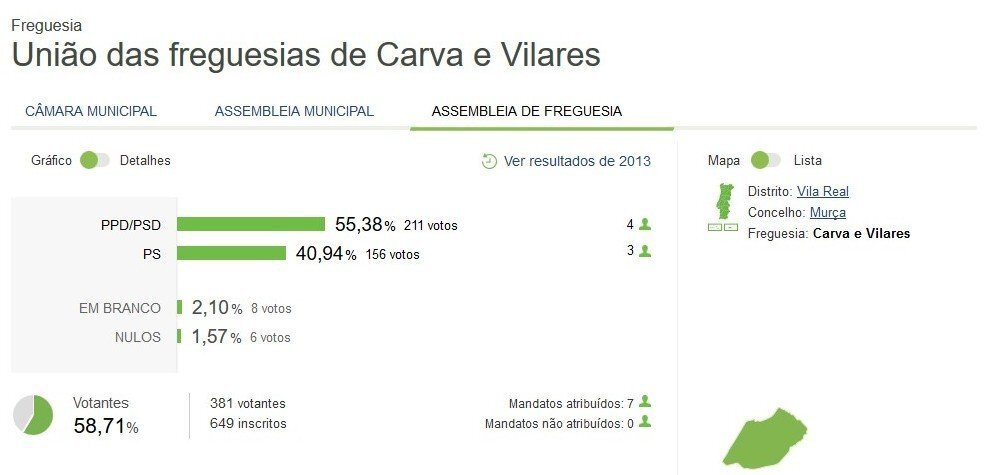 Apresentamos os escrutínios provisórios das Eleições Autárquicas 2017, onde os resultados para a Assembleia de Freguesia da União de Freguesias de Carva e Vilares se distribuem de acordo com a imagem.