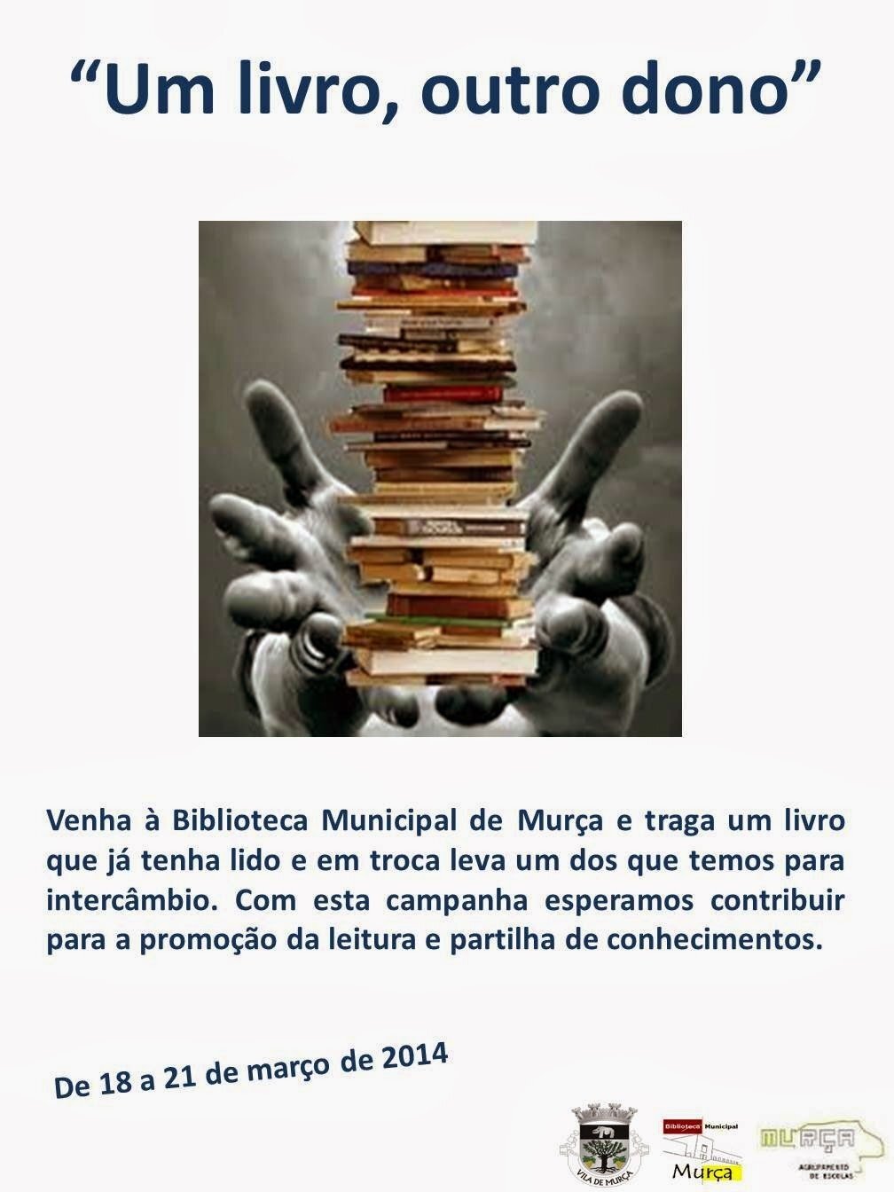 Na semana dedicada à leitura, a Biblioteca Municipal de Murça em parceria com a Biblioteca Escolar do Agrupamento de Escolas de Murça, propõe de 18 a 21 de março uma campanha de troca de livros intitulada "Um livro, outro dono".