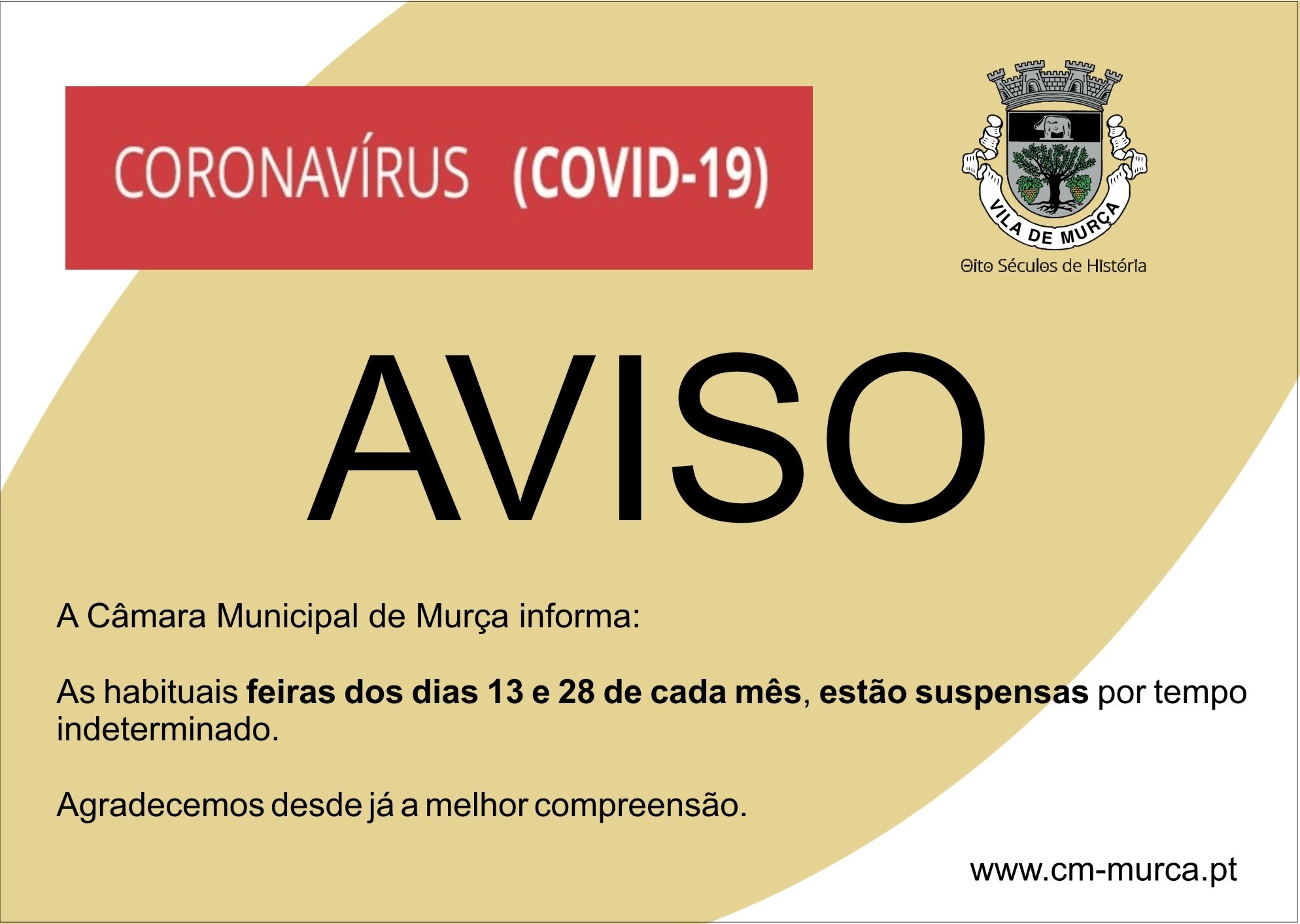 Na sequência do número crescente de casos confirmados por Coronavírus (COVID-19) no nosso País e em particular na Região Norte, informa-se toda a população que a Câmara Municipal de Murça, como medida preventiva e acautelando a saúde pública, suspendeu a realização das habituais feiras dos dias 13 e 28 de cada mês, por tempo indeterminado.